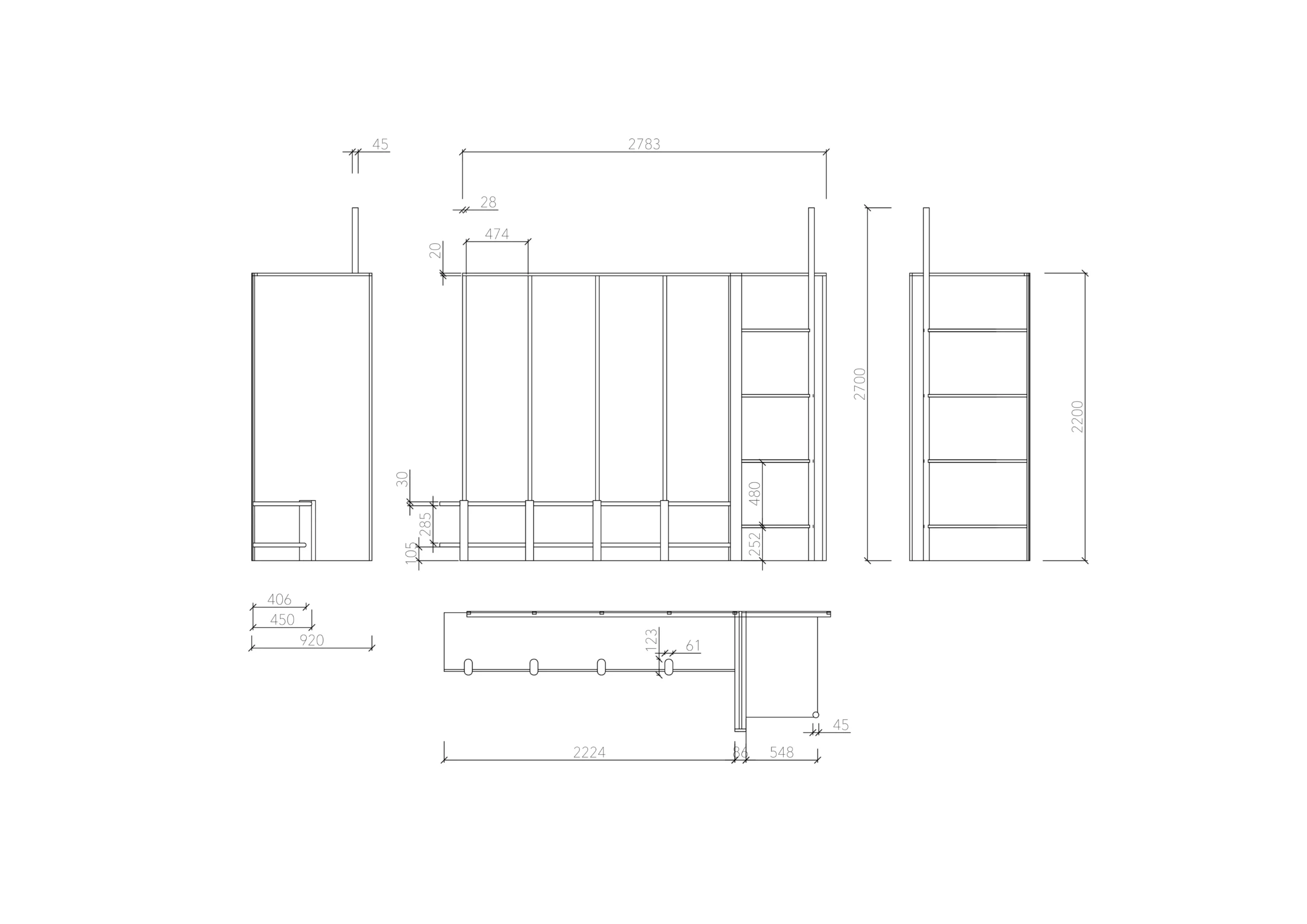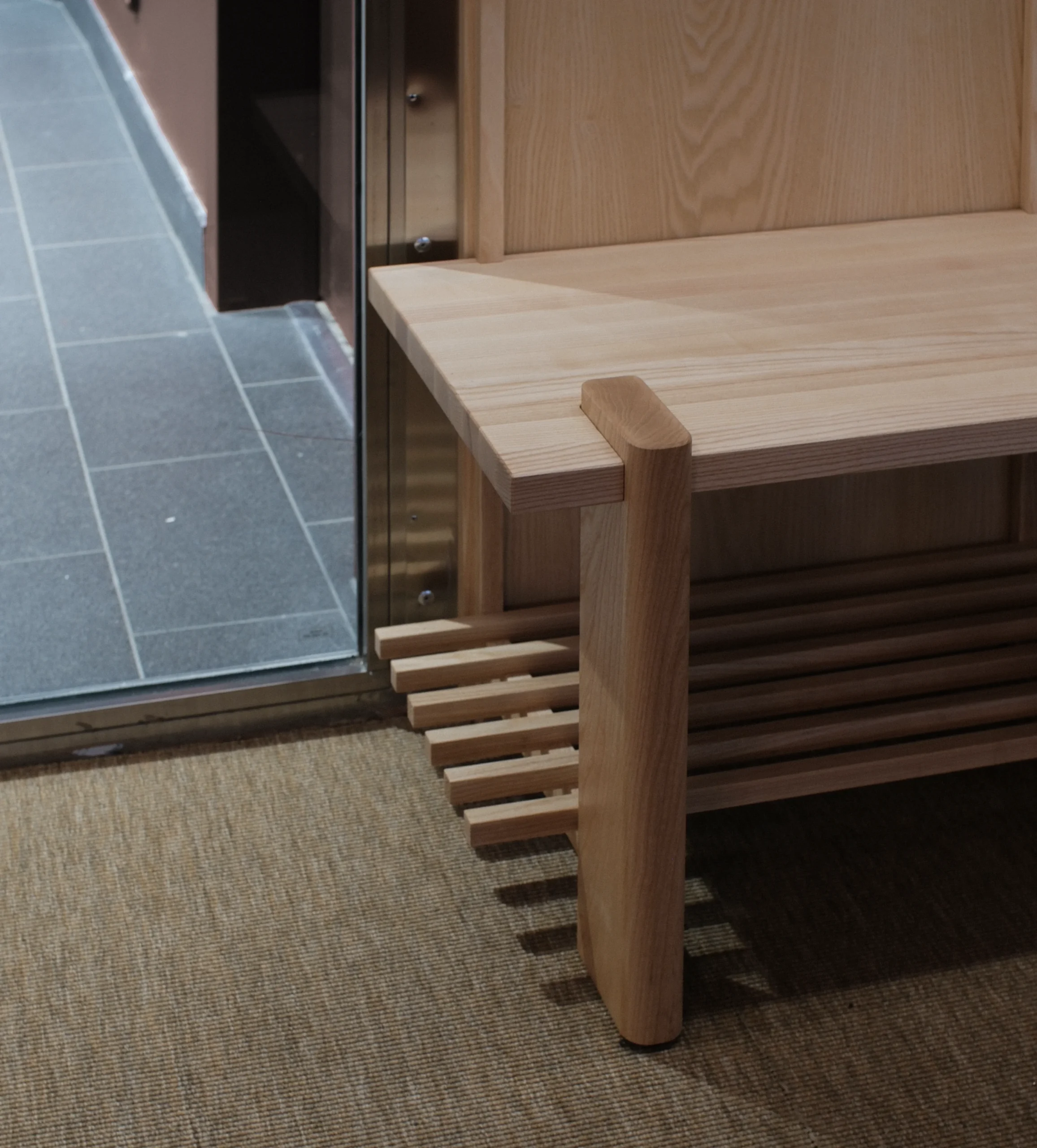 Möbeln delas upp i två delar, där förvaring för väskor döljs och skapar ett hörn och avgränsning. Hörnstaven sträcker sig upp, kopplar samman med taket och kilar sig fast.