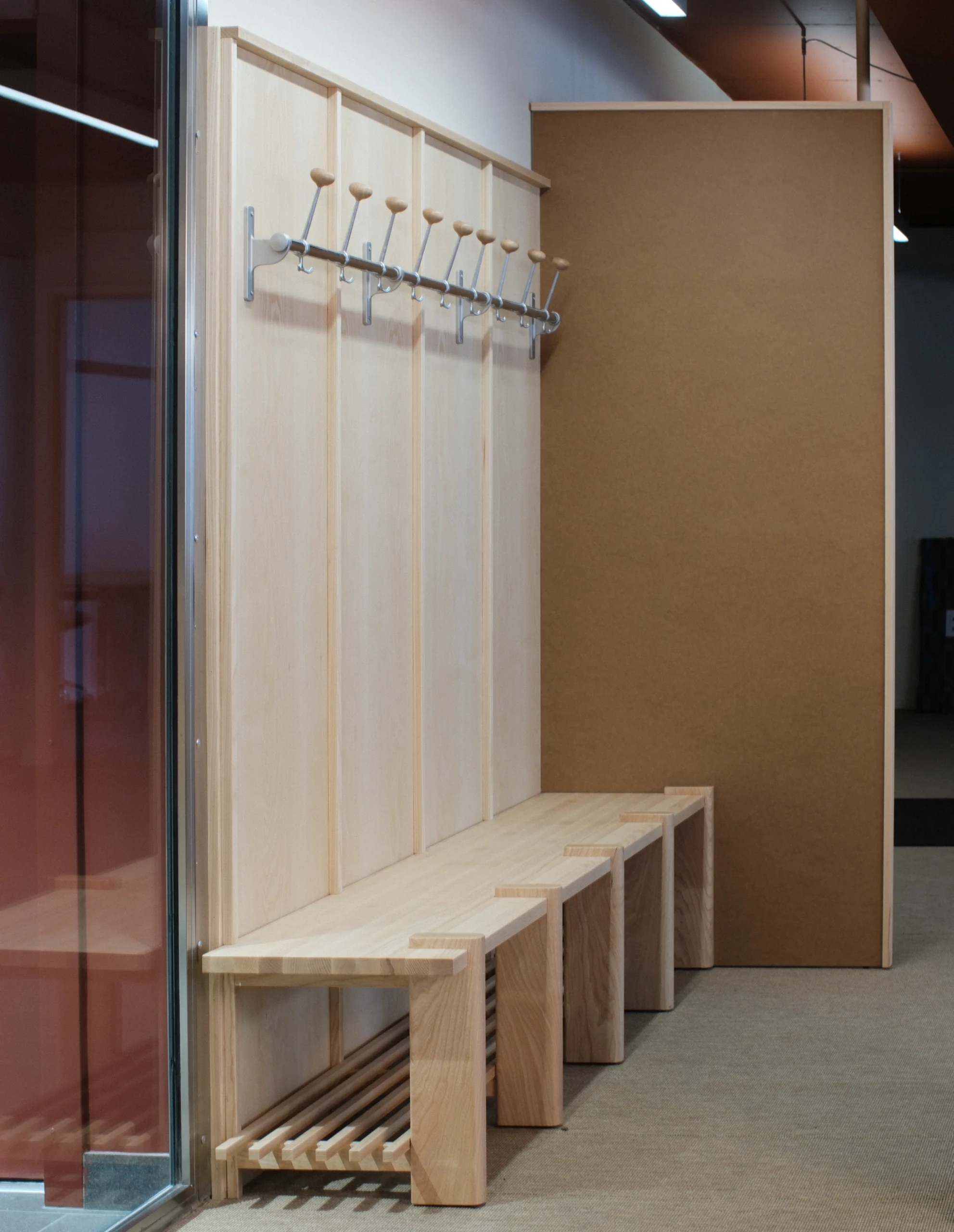 En hallmöbel i ask och MDF med mycket plats för jackor och skor. Behovet fanns också för väskförvaring för långväga gäster.